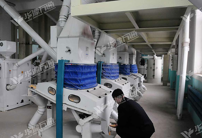 調質工段:經過清理的凈糧經電腦著水機對凈糧加水(1-2%)進入調質倉調質,調質時間8個小時,其目的是軟化胚芽,保證胚芽在脫胚、提胚的過程中胚芽不破碎,提高胚芽的收率。