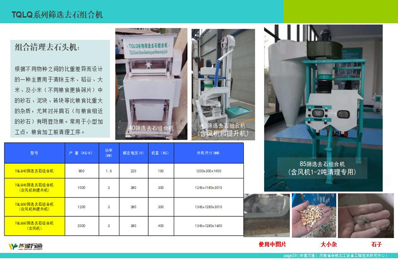 華豫萬(wàn)通生產(chǎn)的TQLS系列組合清理去石機(jī),該系列組合型清理去石機(jī)整合風(fēng)機(jī)、振動(dòng)篩、去石機(jī)為一體的糧食清理設(shè)備,常應(yīng)用于糧食加工中清理去除大中小雜、石頭以及輕雜。其中TQLS-45型清理去石機(jī)常應(yīng)用1噸下糧食清理,而TQLS-85組合清理去石機(jī),精工制作常應(yīng)用于30噸左右糧食加工生產(chǎn)線的前段清理工序。